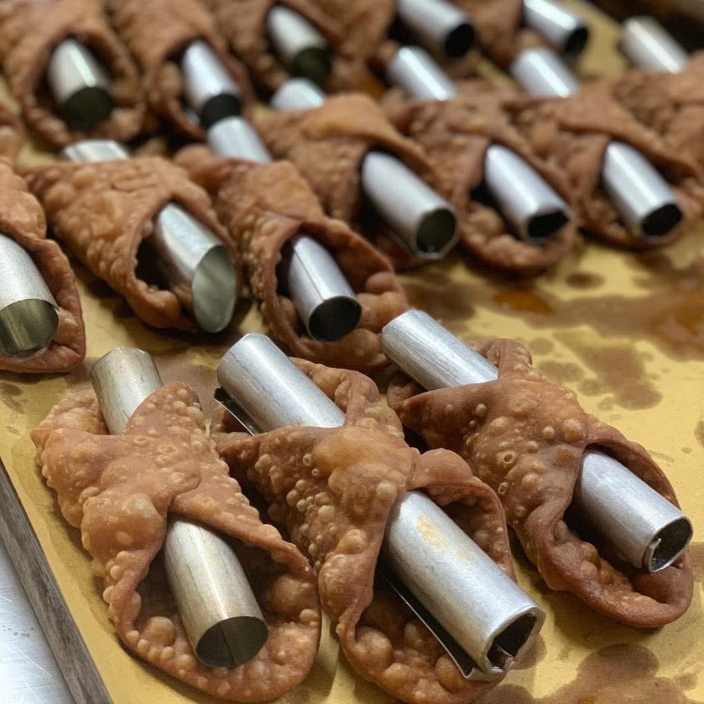 Ik ben opgegroeid met de geur van gefrituurde cannolischillen, in de banketbakkerij van mijn oma, en ik herinner me dat wanneer we ze samen in een productielijn maakten, we rond de marmeren werkbank van de werkplaats verzameld waren, wie ze uitrolde, wie het overtollige meel verwijderde, wie ze insmeerde met ei, en wie ze sloot. Verder weg van het gevaar was er een grote koperen ketel waar ze werden gebakken, waarna oom Nicola de rietjes verwijderde.