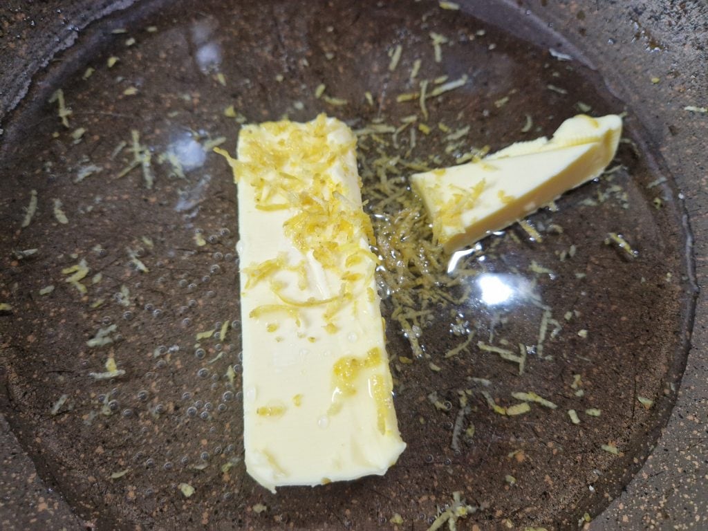 Rasp de citroenschil, voeg deze toe aan de boter en het water in de pan, voeg ook een klein beetje zout en peper toe.