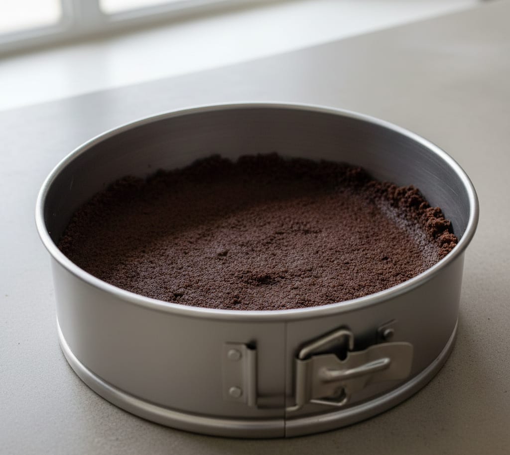 Giet het beslag nu rechtstreeks in de springvorm met een vel bakpapier. Egaliseer het beslag met de achterkant van een lepel of een spatel om een gelijkmatige dikte te krijgen. Bak in een voorverwarmde conventionele oven op 185°C gedurende ongeveer 12 minuten, op het middelste rooster.