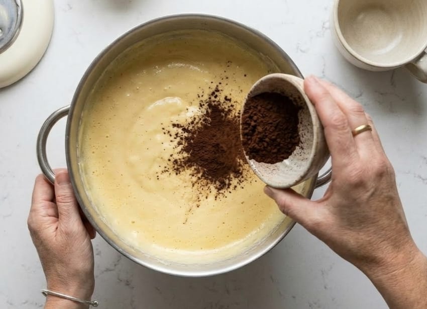 Zeef het cacaopoeder en voeg het ook toe aan het mengsel, meng weer voorzichtig met een spatel van boven naar beneden.