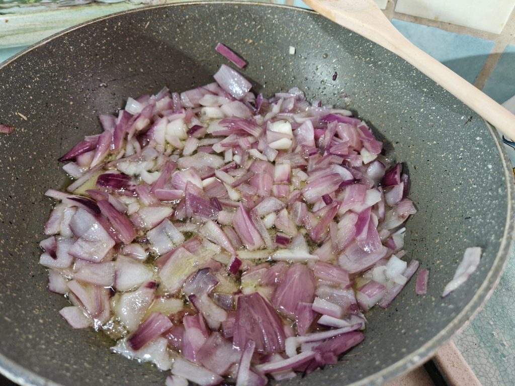 Ze in een pan gedaan met alleen 2 eetlepels extra vergine olijfolie en een snufje zout, zodat het zout hielp om de nodige plantensappen voor het koken vrij te maken.