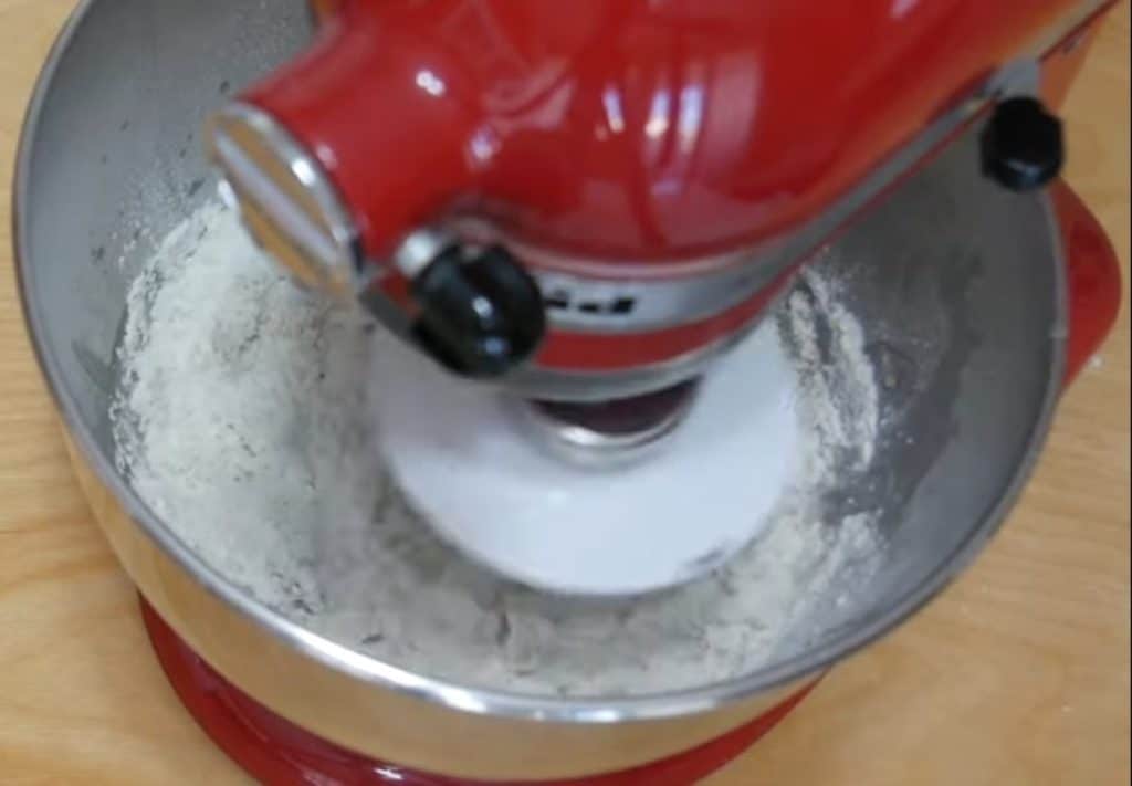Als je geen keukenmachine hebt en het met de hand wilt doen, doe dan het volgende: Maak met de bloem een fontein met een gat in het midden, plaats in het midden alle poeders, het zout en de suiker en meng,