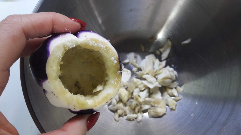 • Neem nu 1 miniaubergine in de hand en hol deze uit met een uitsteekvorm of een theelepel, maar pas op dat je hem niet doorboort