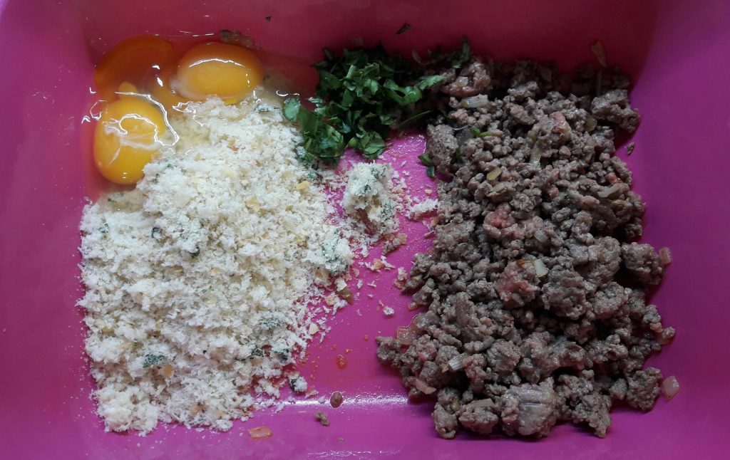 • Maak de vulling af: doe in een kom het gehakt, het paneermeel, 5 in stukjes gescheurde basilicumblaadjes, 2 eieren, de Parmigiano, zout, peper en het vruchtvlees van de miniaubergines.