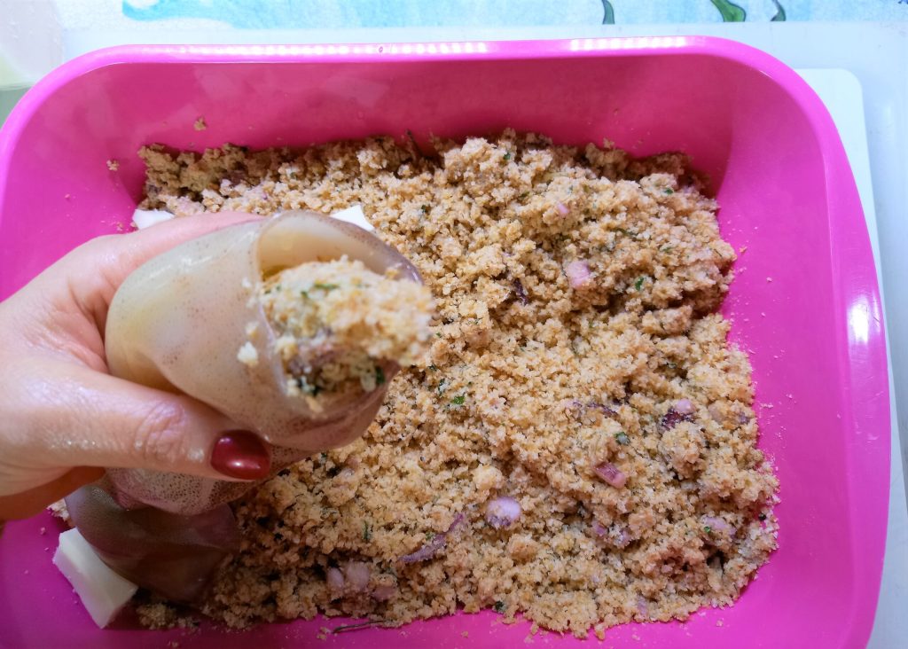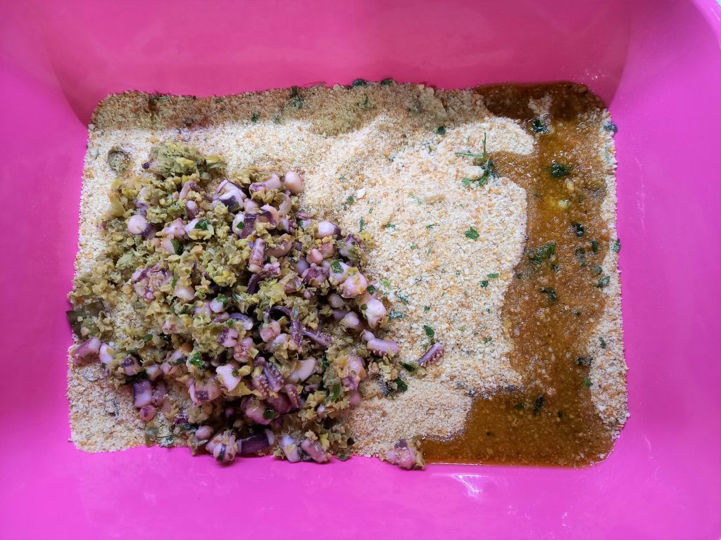 de tentakels, de gehakte peterselie en knoflook, de geraspte pecorino Romano, een snufje zout en peper naar wens.