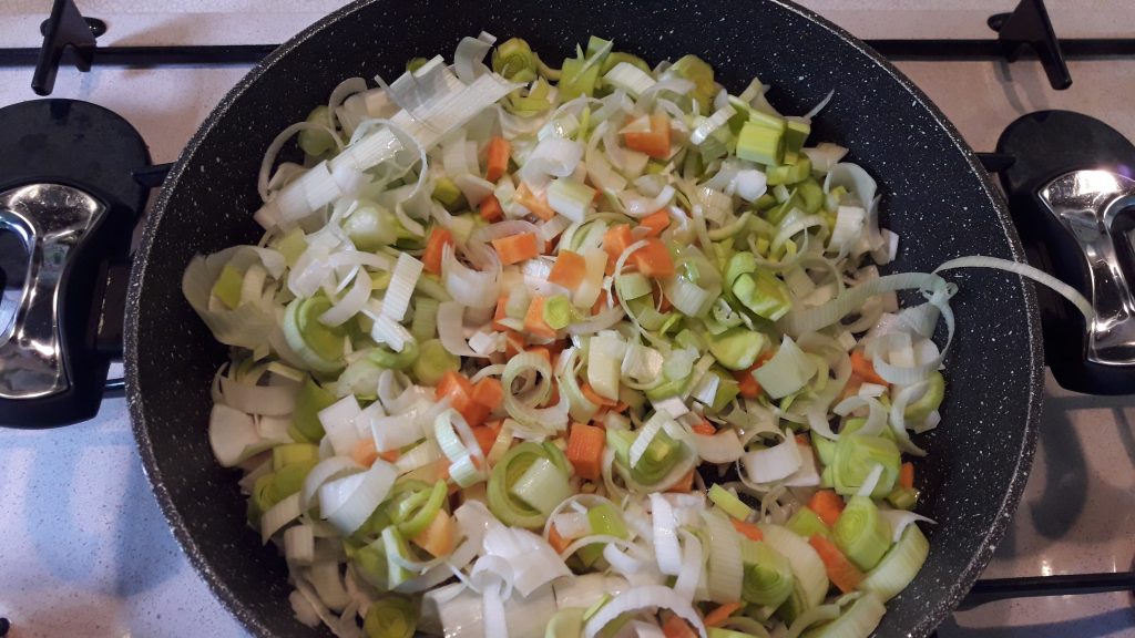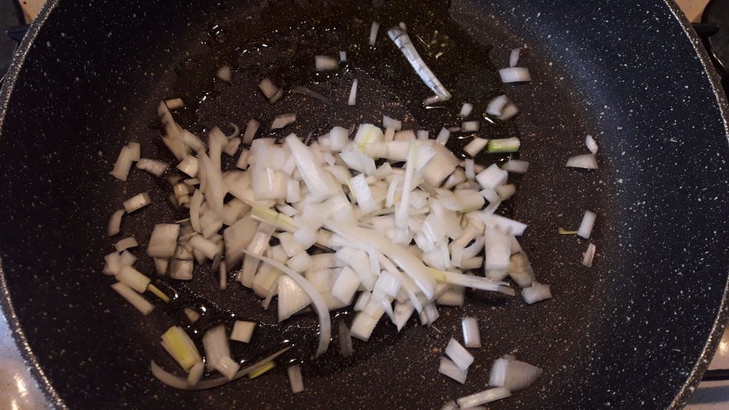 In een antiaanbakpan doe je een scheutje olie, en de grofgehakte ui, en laat je 3 minuten fruiten.