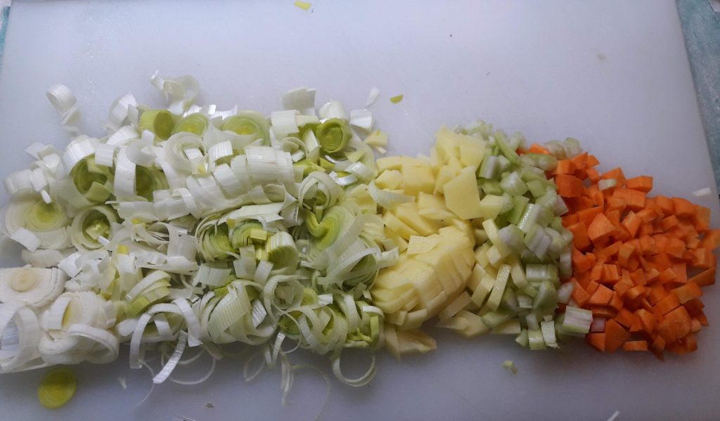 Snijd ze in stukjes, maar de ui in kleinere stukjes.