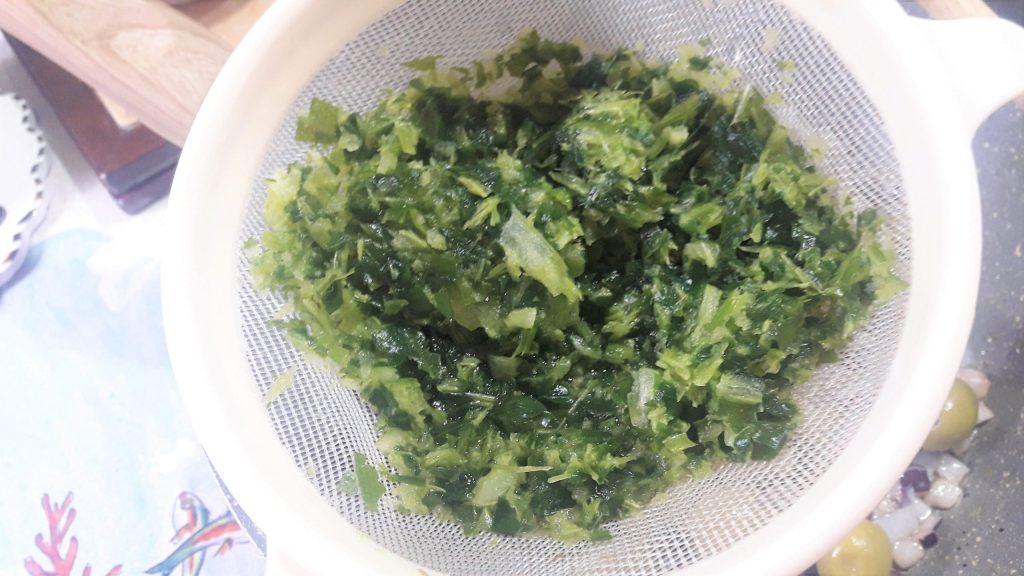de reeds ontzoute groene olijven, dit alles terwijl de ui bakt, en…