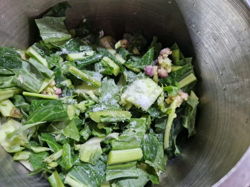 Om de kool-, bloemkool- en snijbietbladeren te gebruiken, is de eerste stap om ze van de stengel te scheiden en ze onder stromend water te wassen.