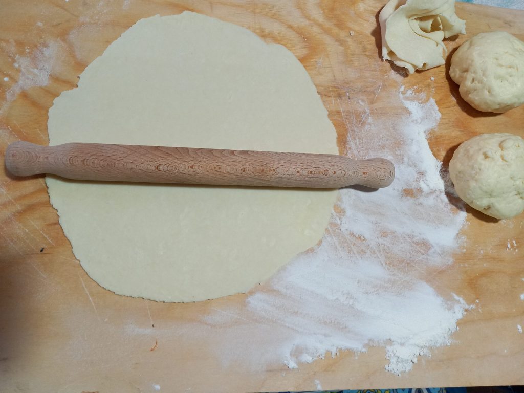 Na de rusttijd bestuif je het werkoppervlak met bloem en vorm je een rol.