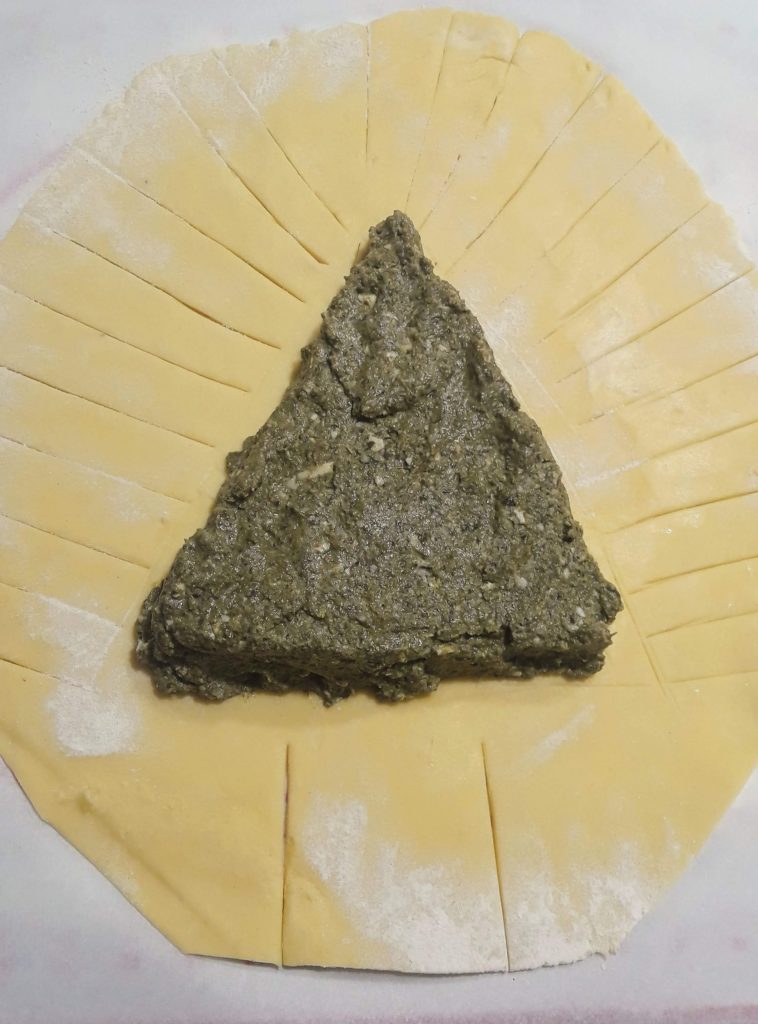 Ik heb de vulling in het midden gegoten, ongeveer 1 cm hoog, in de vorm van een gelijkbenige driehoek, met de achterkant van een lepel gladgemaakt.
