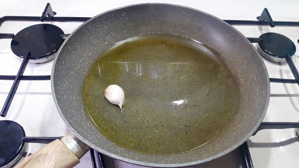 We bakken ze in een koekenpan met een teentje knoflook in de schil, een takje rozemarijn, en de helft extra vierge olijfolie en de helft zonnebloemolie.