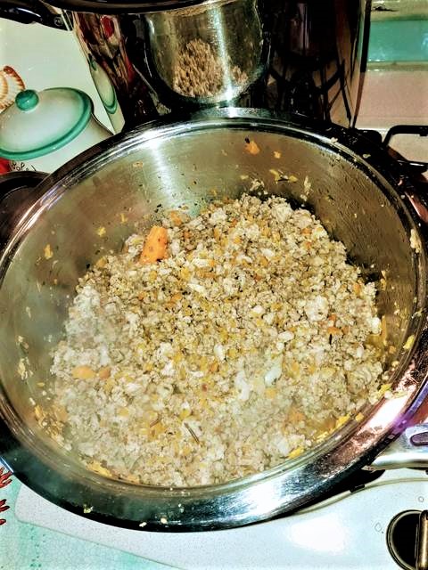 Wanneer de ui goudbruin is, voeg je het gehakt en de worst toe, en meng je tot ze verkleuren. Daarna breng je op smaak met peper.