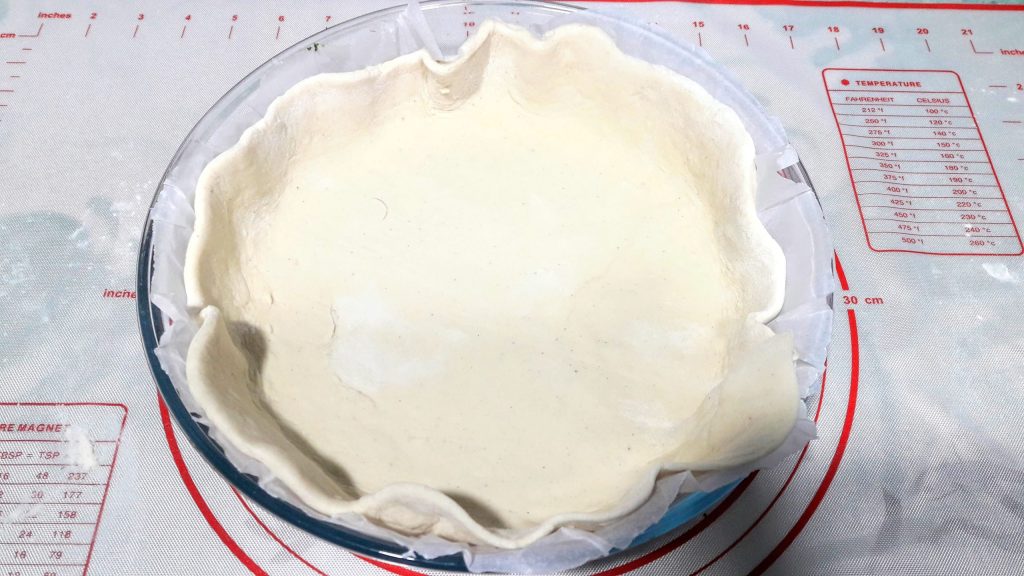 Leg het bakpapier in een bakvorm en leg daarop het brisèdeeg met de randen die de zijkanten van de bakvorm bedekken.