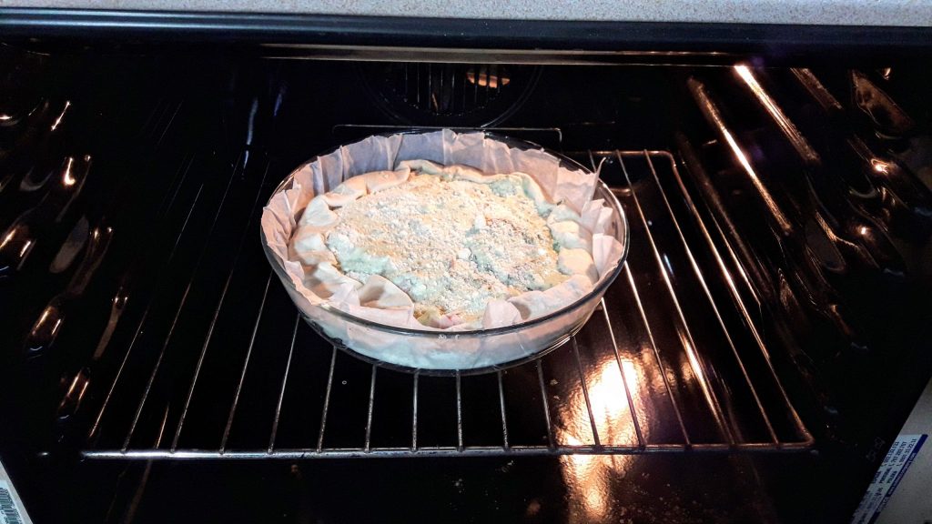 Giet het mengsel van ricotta en eieren en vouw de overtollige randen van het brisèdeeg om.