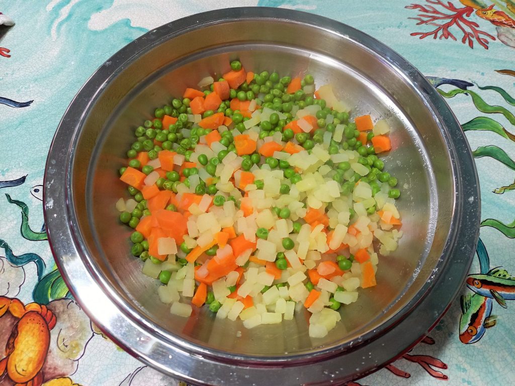 Snijd de groenten in kleine blokjes en kook ze in gezouten water. Kook ze 5 minuten en laat ze daarna afkoelen onder koud water.