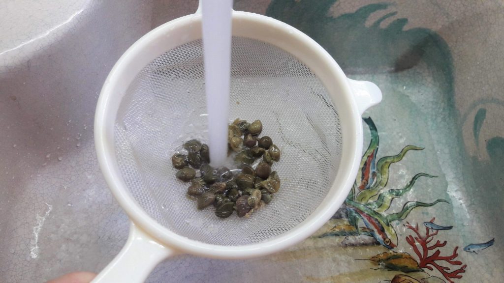 Voeg de yoghurt met kappertjes en peper toe en meng.
