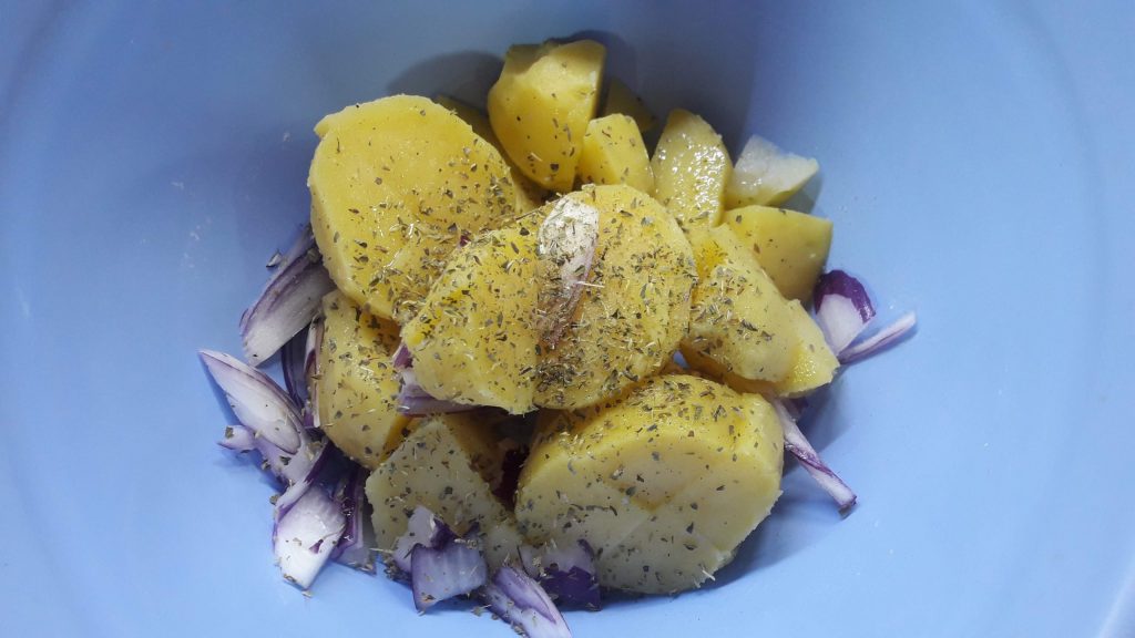 Nu gaan we de salade bereiden: plaats de in stukjes gesneden aardappelen in een kom, voeg de ui, olijfolie, en oregano toe, dan..
