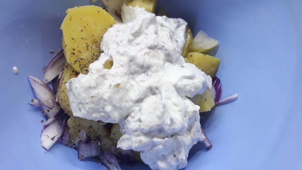 Voorbereiding van de Mediterraanse aardappel- en yoghurt salade