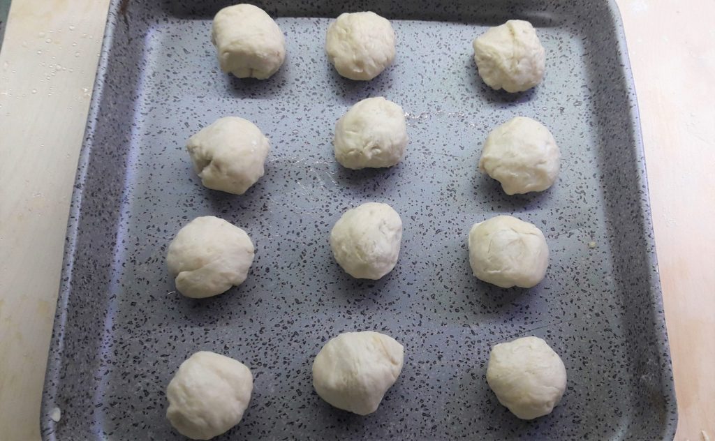 • Plaats ze op een antiaanbaklaag of met bakpapier op een bakplaat, zorg ervoor dat ze goed gescheiden zijn, en laat ze 1,5 uur rijzen bedekt in de warmte.