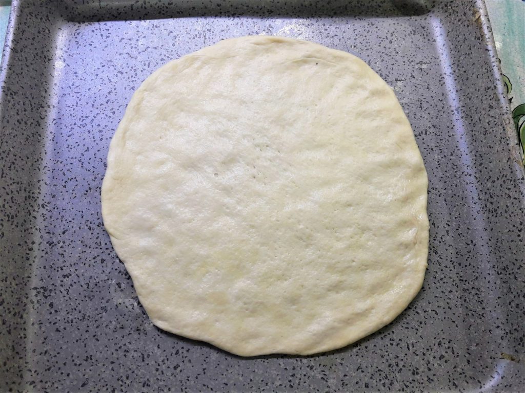 • Wanneer je klaar bent, heb je een cirkel gevormd. Rol deze plat met de deegroller tot ongeveer 5 mm dik.