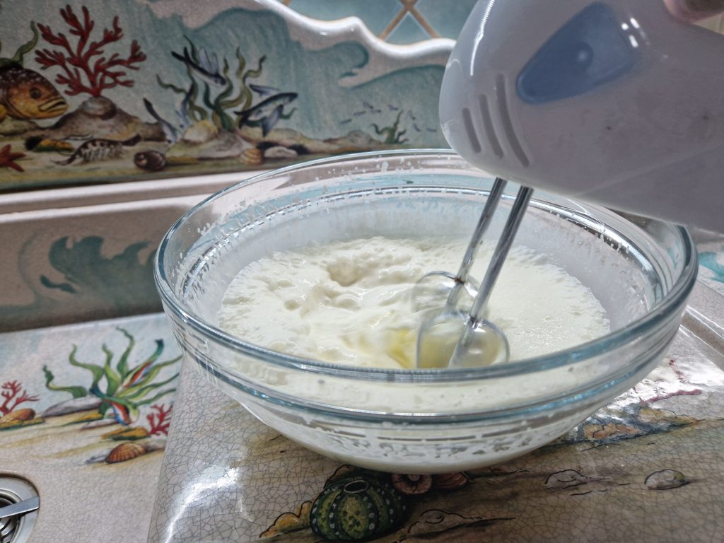 • Schei de dooiers van de eiwitten, neem alleen de dooiers en voeg 50 g water toe en klop ze, met de maatbeker voor 3 minuten op 80 ° snelheid 5.