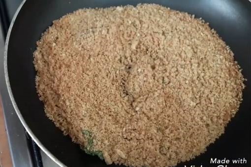 Doe het gekruide paneermeel in een pan en rooster het tot het goudbruin is.