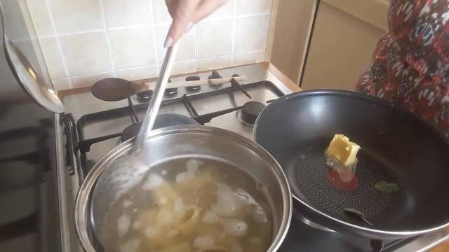 Zodra de pasta voor driekwart gaar is, schep je het met de schuimspaan uit het water en voeg je het, zonder het uit te laten lekken, toe aan de boter.