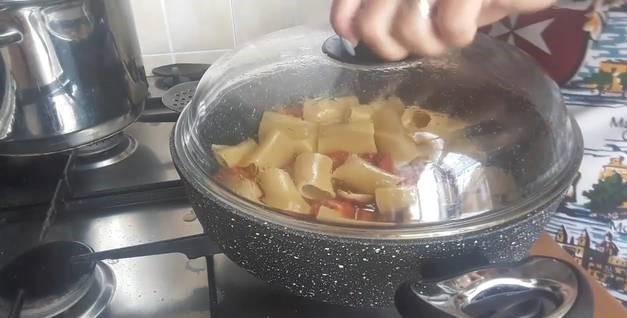 Zodra de paccheri driekwart gaar zijn, giet ze af, maar gooi het kookwater niet weg.