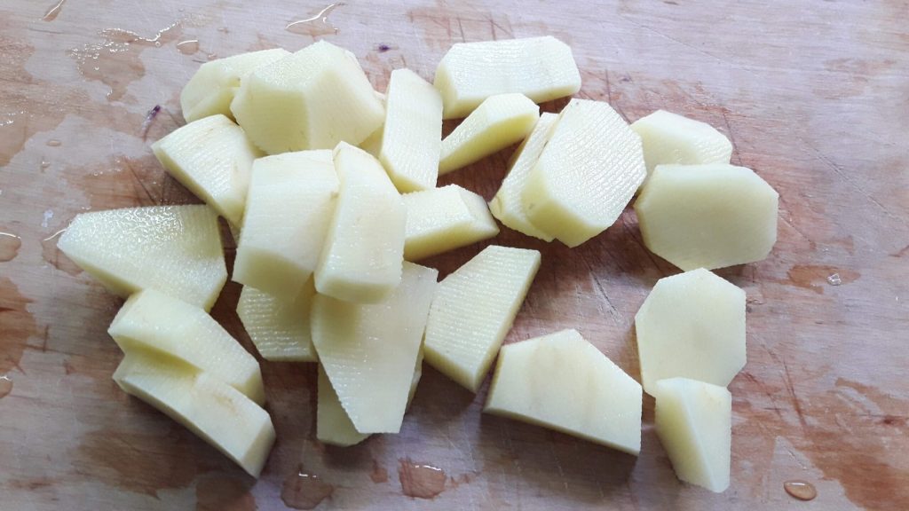 Voeg 150 g water en de in blokjes gesneden aardappelen toe en kook gedurende 15 minuten.