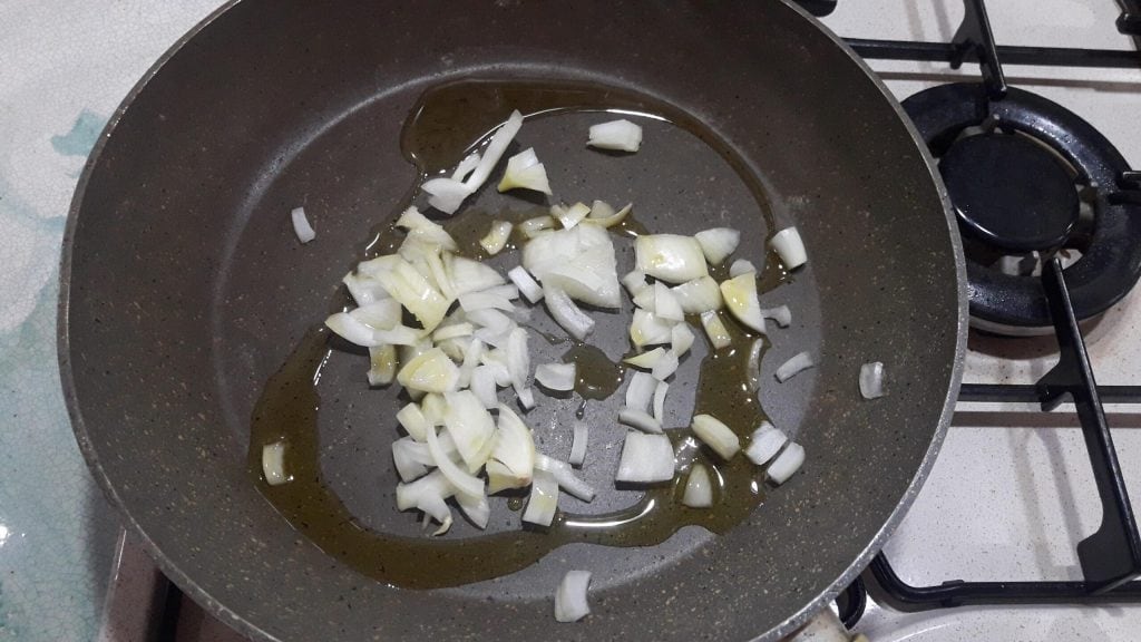 Schil de ui, snijd deze vrij grof en bak deze gedurende 3 minuten met de extra vierge olijfolie.