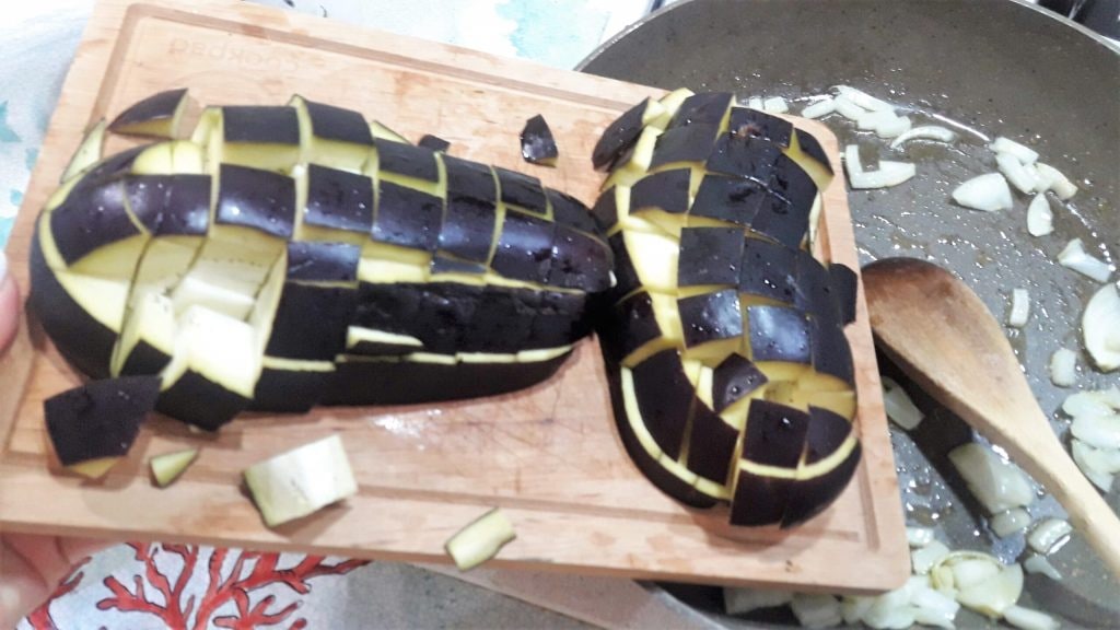 Snijd de aubergine in blokjes, zonder de schil te verwijderen.