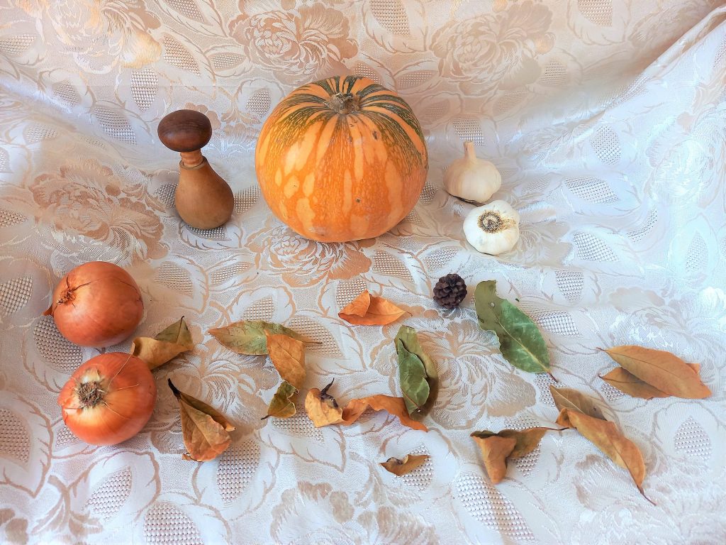 Snijd de ui fijn, terwijl je de pompoen en de aardappelen in blokjes snijdt.