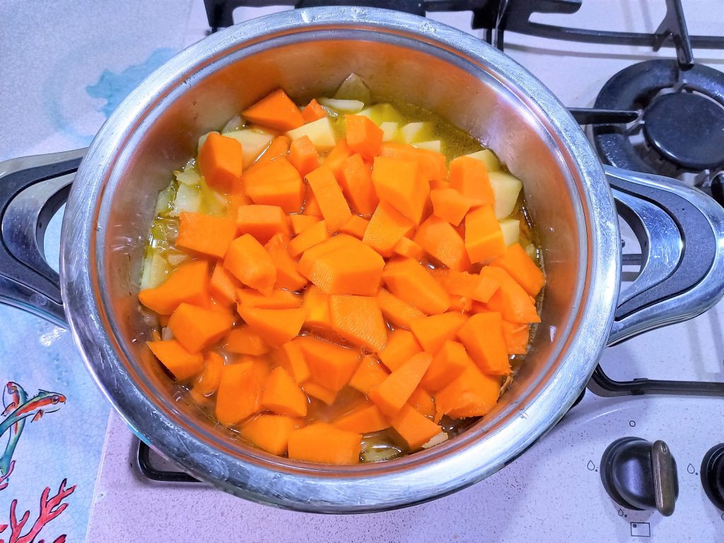 • Doe de olijfolie en de ui in een pan en laat het 3 minuten smaken, voeg dan de pompoen en de aardappelen toe. Meng.