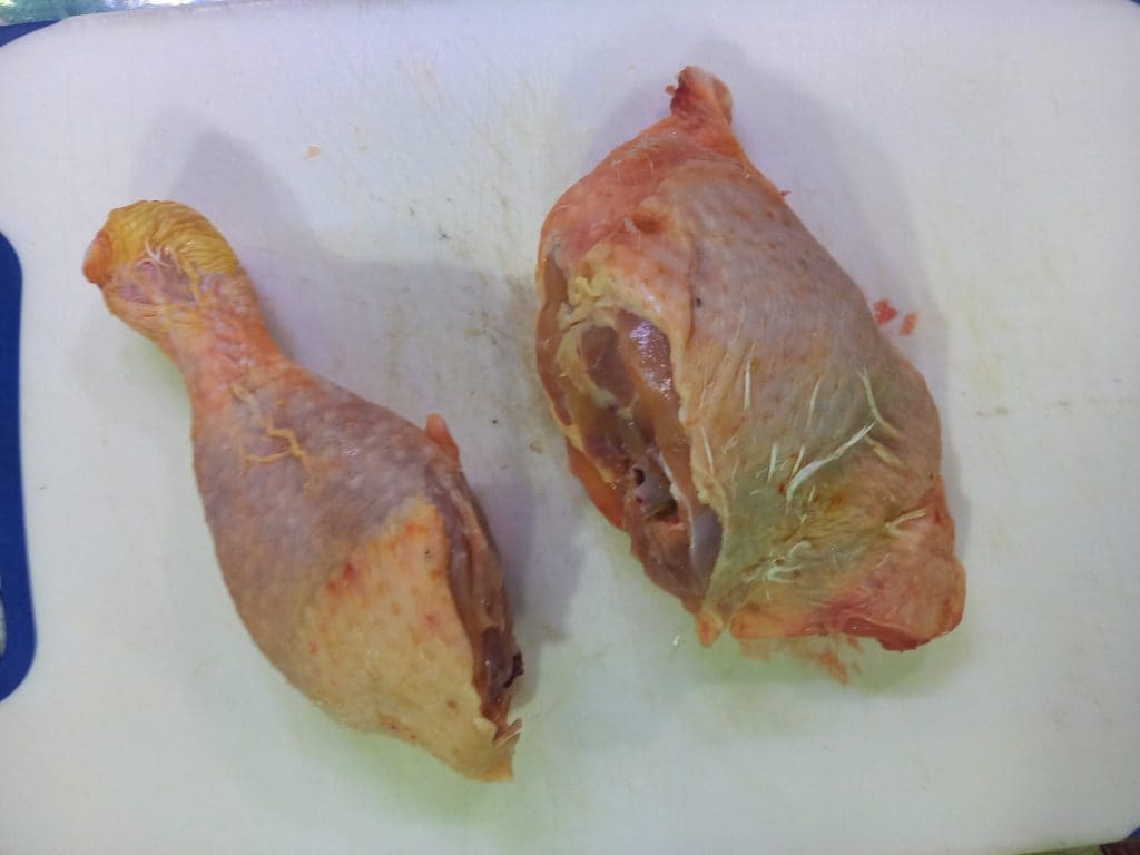 Het eerste wat je moet doen is kippendijen of alleen drumsticks kiezen. Verwijder de huid, verwijder de restjes van de veren en snijd ze zoals op de foto.