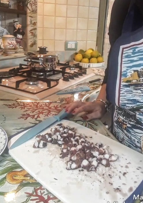 Rooster de stukjes octopus in een pan, laat het water eenmaal verdampen en voeg dan extra vierge olijfolie toe, sluit het deksel en ga door met koken voor nog eens drie tot vier minuten.