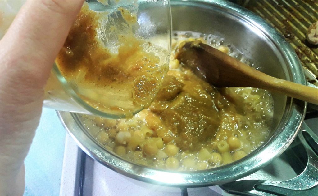 Wanneer de kikkererwten gaar zijn, heb ik ze overgebracht naar een handigere pan, gecontroleerd of het niveau van hun bouillon voldoende was (ongeveer 2 vingers boven de peulvruchten), weer aan de kook gebracht en de pasta toegevoegd.