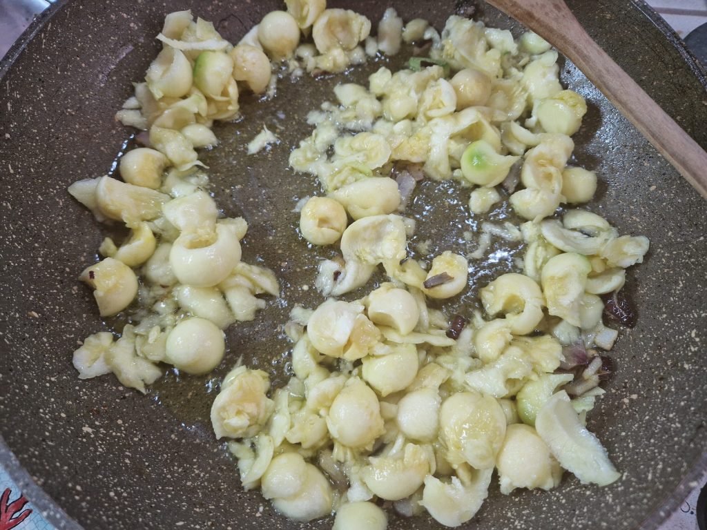 terwijl in het resterende deel in de pan voeg je de vulling van de courgettes toe die je eerder hebt uitgehold,