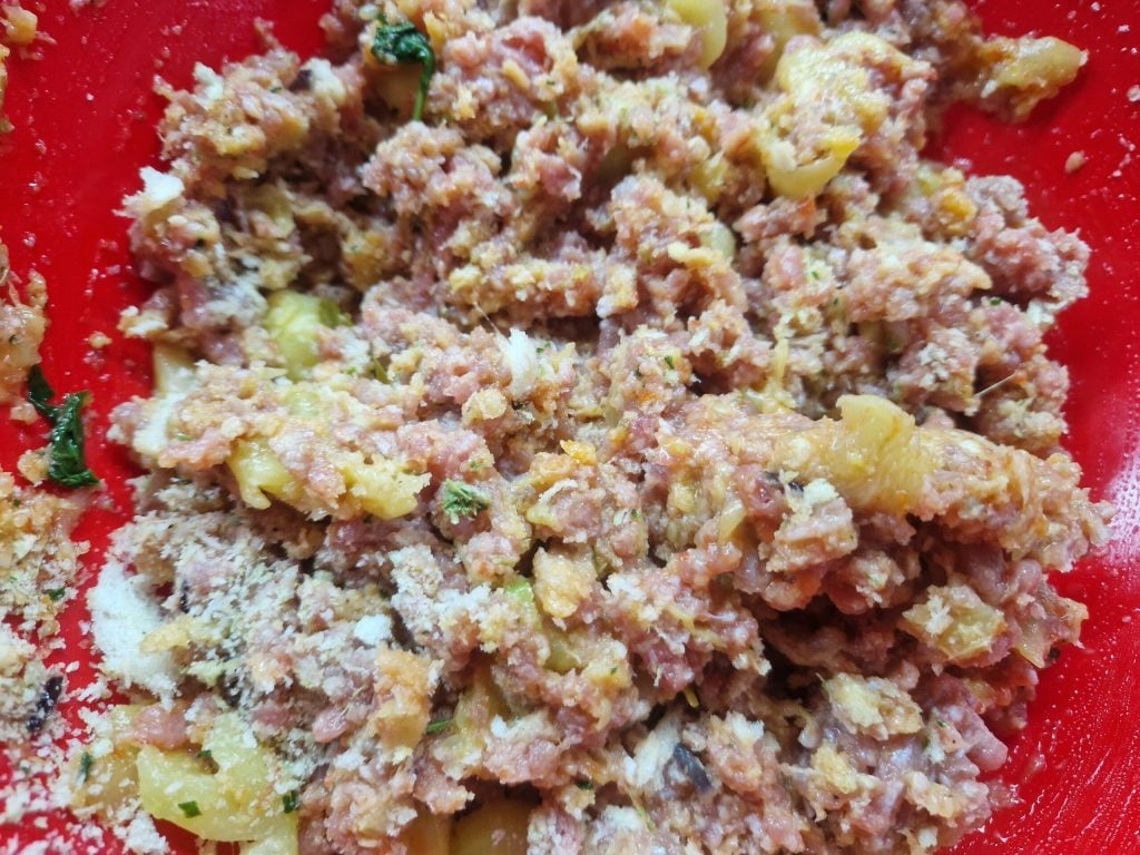 In een kom voeg het gehakt, de inhoud van de pan en het Siciliaanse gekruide paneermeel samen. Meng goed. Het mengsel moet zacht zijn