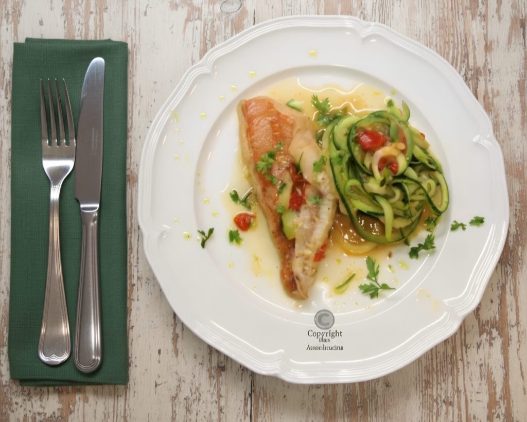 Vandaag wilde ik dit gerecht maken, denkend aan mijn dieet. Dat komt omdat roodbaars delicaat vlees heeft dat bijna vetvrij is, en courgettes, niet te vergeten, behoren tot de meest caloriearme groenten die ik ken. In dit gerecht, goed gecombineerd met tomaatjes, geven ze zelfs voor iemand zoals ik, die om de lijn geeft, voldoening aan de smaakpapillen.