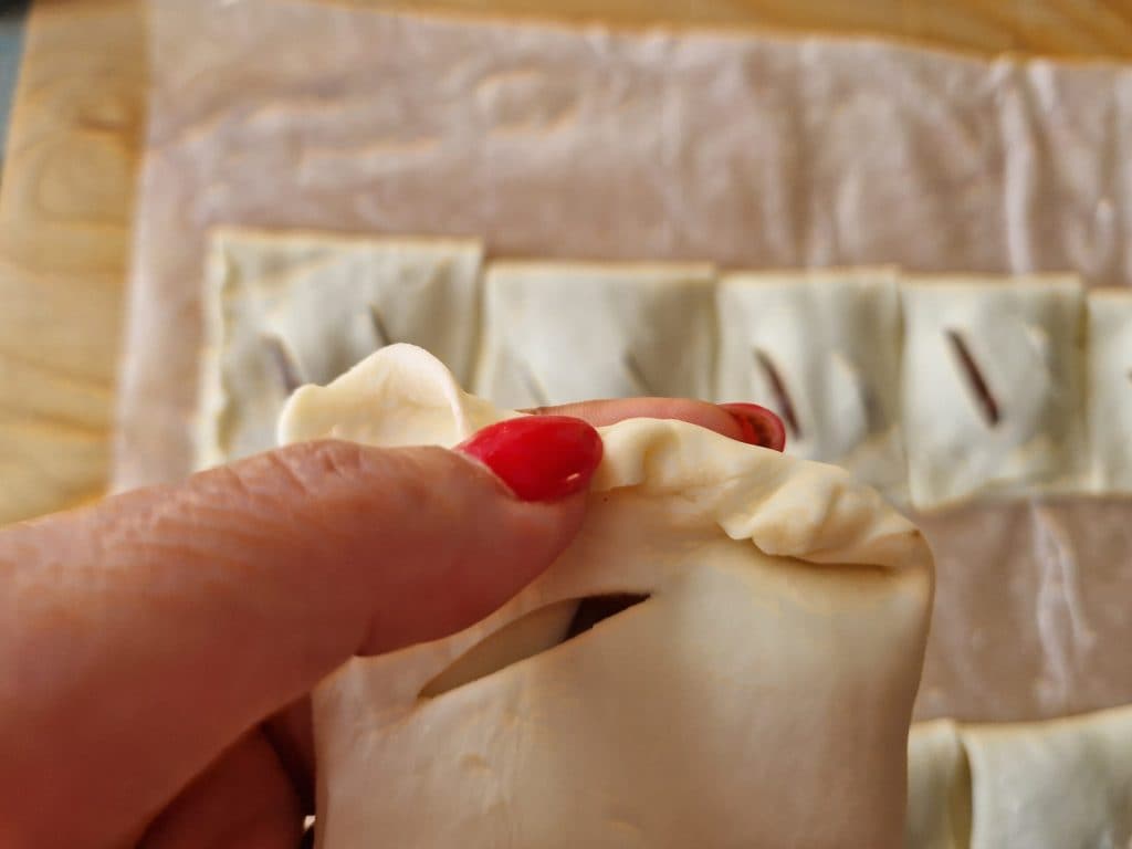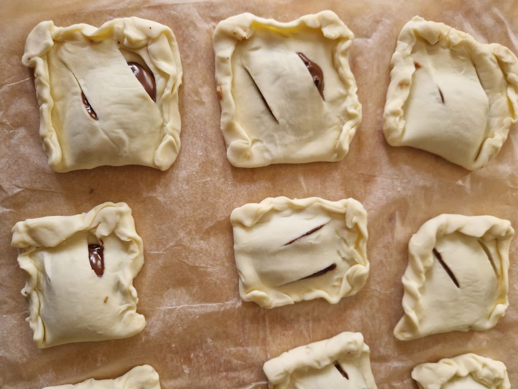 • Als je voor de chocolade kiest, leg dan 2 stukjes of kruimels op elke rechthoek van het bladerdeeg aan de kant waar geen inkepingen zijn.