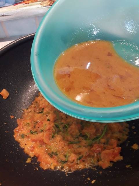 Doe in een aparte wok een scheutje olie en kook de tomaat in stukjes en de peterselie door het met een lepel te pletten, dan…