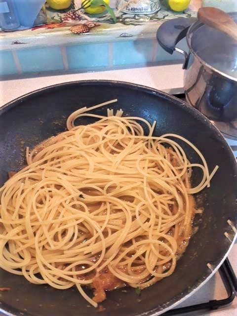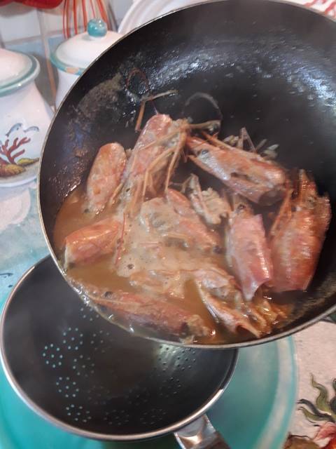 Zet het water voor de pasta op het vuur en haal de grote garnalen uit de saus die je net hebt gemaakt……