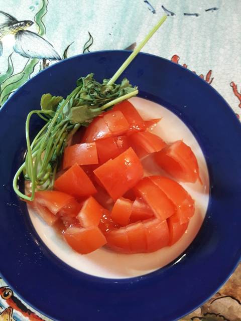 Snijd de tomaat in stukjes, hak de peterselie, maar laat een deel heel.