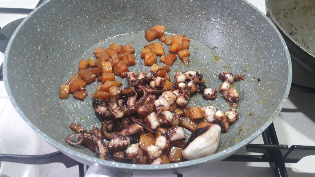 Voeg de octopus toe aan de rest van de pompoen in de pan,