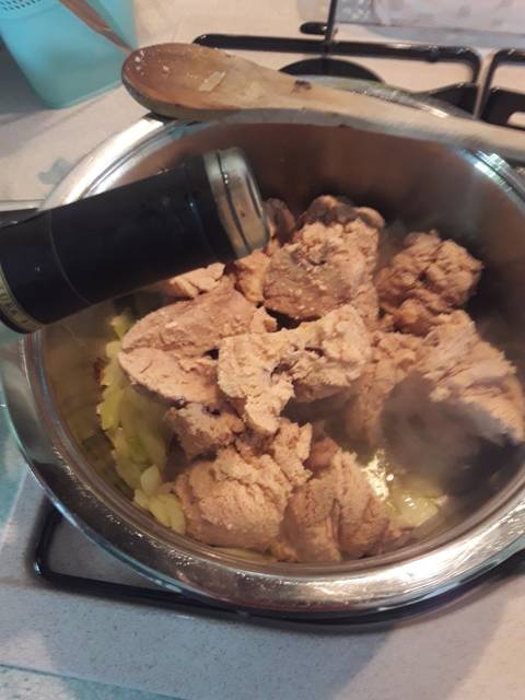 Giet de stukjes, breng op smaak met zout, zet het vuur lager en laat ongeveer 20 minuten koken, af en toe roerend.