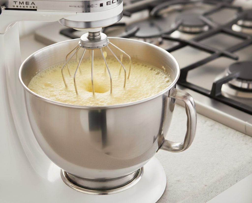 Ondertussen verwarmen we in een pannetje 40 g water met 60 g suiker tot een temperatuur van 121°; op dat moment voegen we het suiker-waterstroopje toe aan de opgeklopte dooiers en blijven we op hoge snelheid kloppen tot ze mooi schuimig worden.