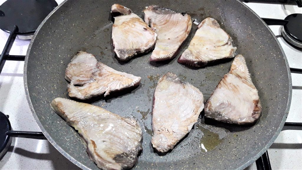 We beginnen, door de buitenkant van de tonijnplakken te verwijderen