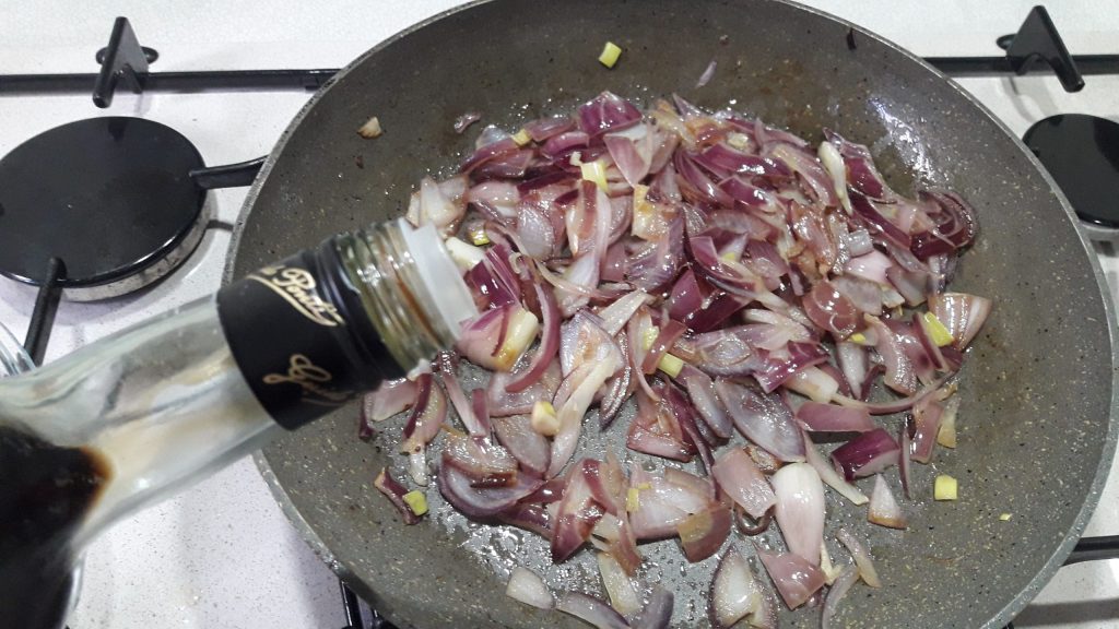 Na 4 minuten, bevochtig de uien met de balsamicoazijn, en laat verdampen.