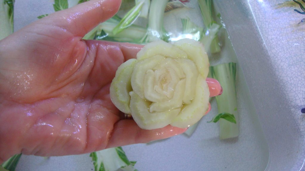 Snijd het uiteinde van de snijbiet en gooi het weg, snijd vervolgens een centimeter verder voor deze ‘rozen’ van snijbiet die we zullen gebruiken voor het serveren.